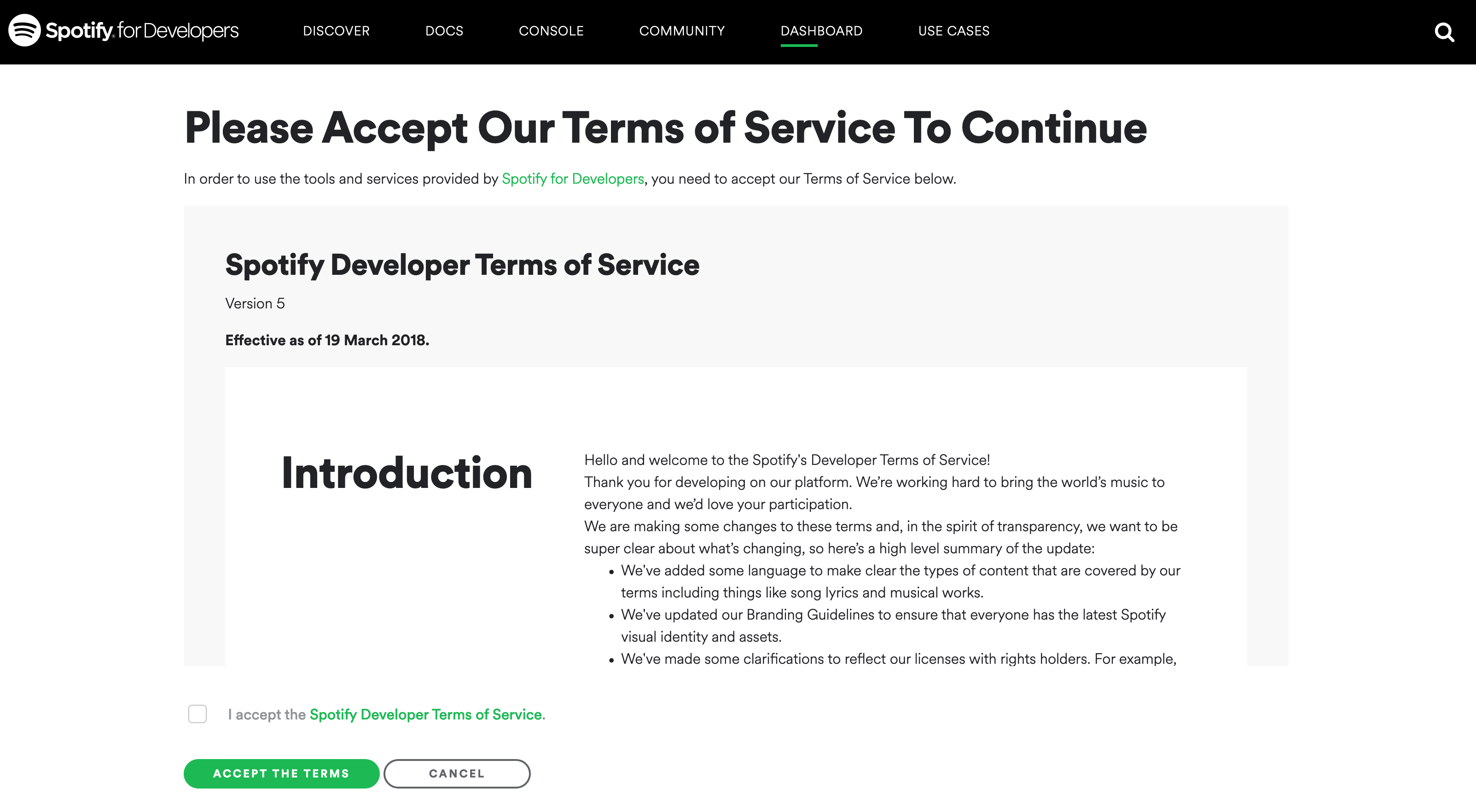 스포티파이 API를 쓰려면 먼저 Spotify for Developers 대시보드에서 계정을 만들어야 합니다. 로그인을 마치고 개발자 약관에 동의하는 과정을 거치게 되죠 (Figure 7.3).