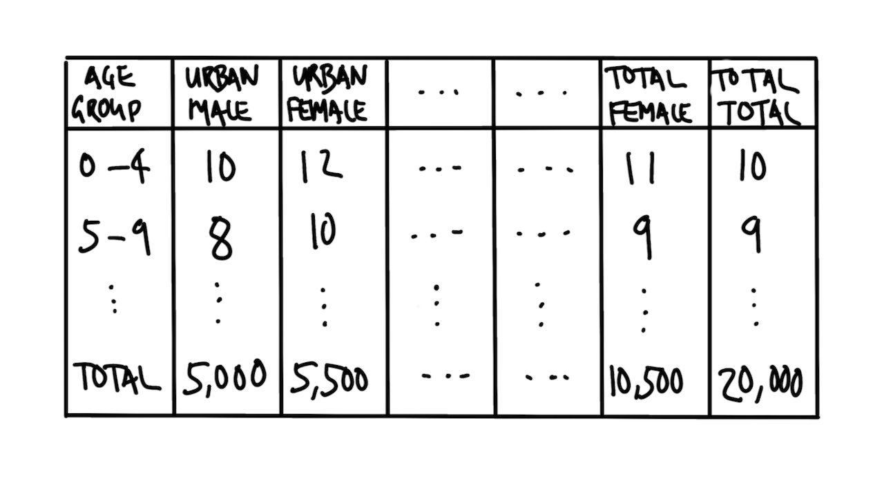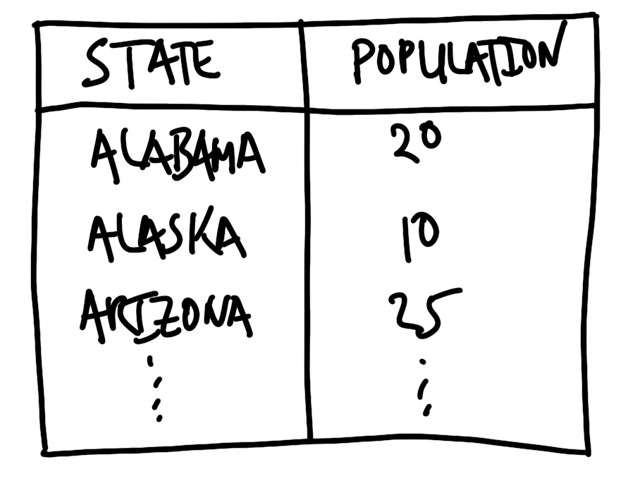 먼저 우리가 만들고자 하는 데이터셋의 구조를 스케치해 보세요. 열(Column) 이름, 데이터 타입(Class), 그리고 데이터가 가질 수 있는 값의 범위 등을 미리 구상하는 것입니다. 예를 들어 미국 각 주의 인구 데이터에 관심이 있다면, Figure 9.1 과 같은 형태로 스케치를 그려볼 수 있습니다.