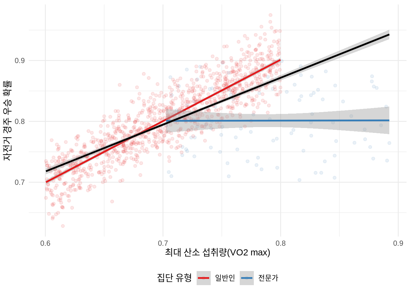 예를 들어, 프로 사이클 선수들만을 대상으로 조사하면 폐활량과 우승 확률 사이에 아무런 관련이 없는 것처럼 보일 수 있습니다(Coyle et al. 1988; Podlogar, Leo, and Spragg 2022). 이는 프로 선수들은 이미 매우 높은 폐활량을 가진 사람들로만 구성되어 있어, 그 집단 내부에서는 폐활량이 더 이상 승패를 가르는 변별력을 가지지 못하기 때문입니다. 이러한 표본 선택 편향이 가져오는 결론의 오류를 시뮬레이션(Figure 15.3)을 통해 살펴보겠습니다.