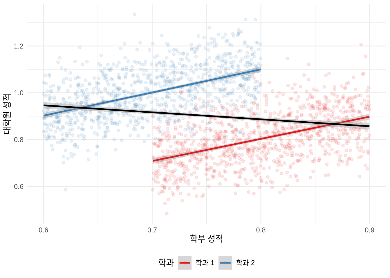 예를 들어, 학과별로는 학부 성적과 대학원 성적이 뚜렷한 양(+)의 상관관계를 보이더라도, 여러 학과를 하나로 합쳐서 분석하면 마치 음(-)의 관계가 있는 것처럼 보일 수 있습니다. 시뮬레이션 데이터를 통해 이 현상을 직접 확인해 보겠습니다(Figure 15.1).