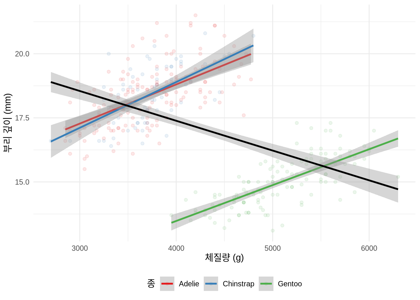 최근에는 palmerpenguins 데이터셋에서 펭귄의 체질량과 부리 깊이 사이의 관계를 통해서도 심슨의 역설을 발견할 수 있습니다(Figure 15.2). 전체 펭귄을 대상으로 분석하면 음(-)의 상관관계가 나타나지만, 종별로 나누어 보면 각각 양(+)의 상관관계가 나타나는 것을 확인할 수 있습니다.