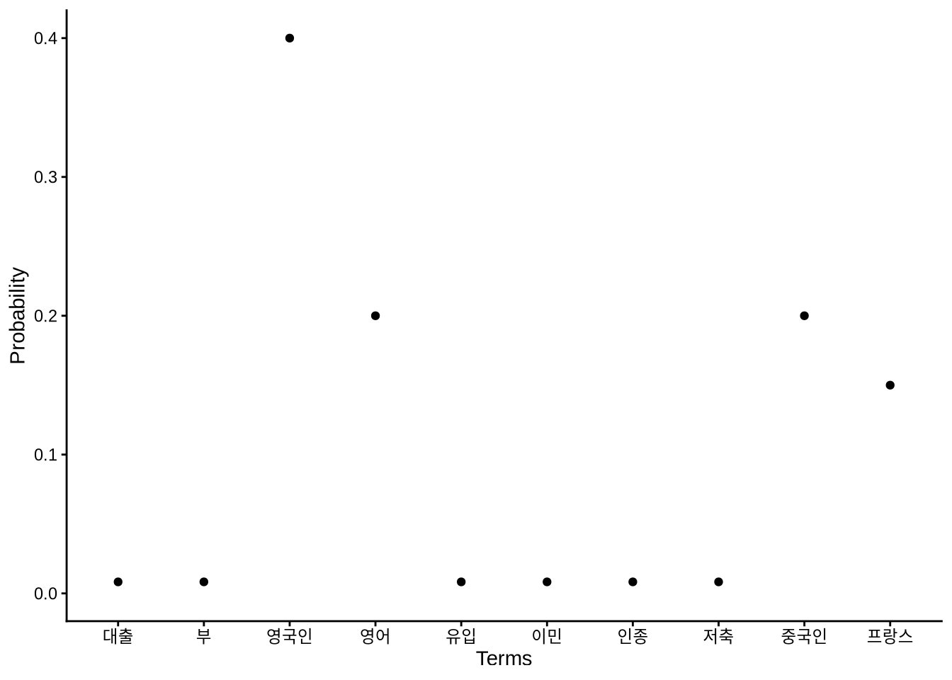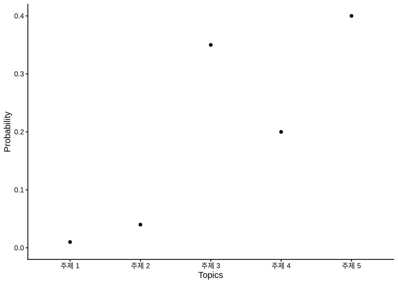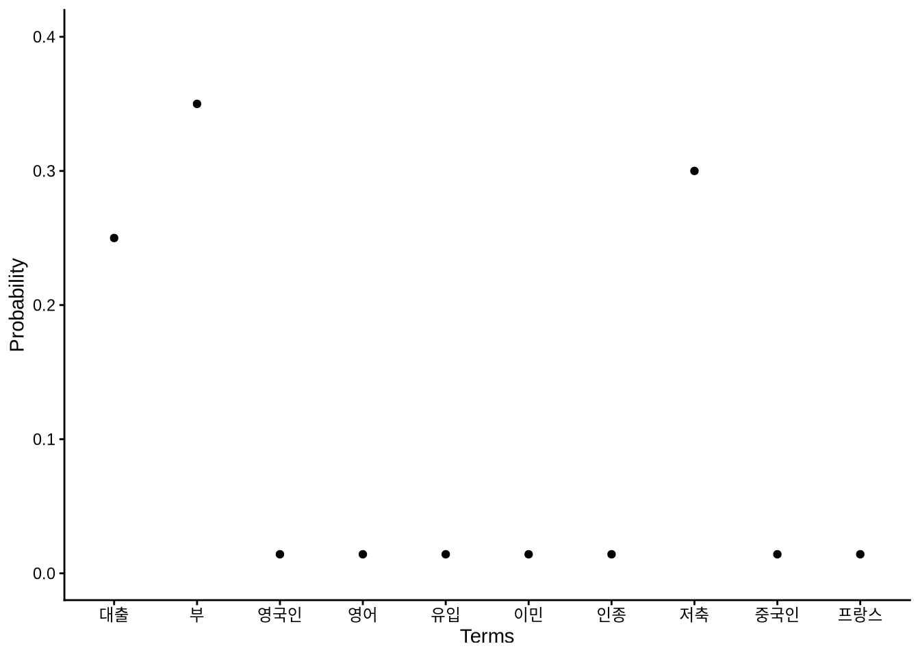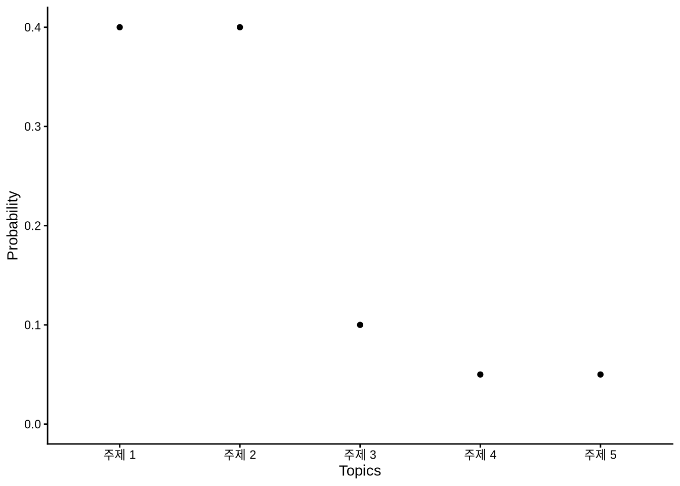 각 문서의 용어를 관찰하면 주제의 추정치를 얻을 수 있습니다(Steyvers and Griffiths 2006). LDA 프로세스의 결과는 확률 분포입니다. 이 분포가 주제를 정의합니다. 각 용어는 특정 주제의 구성원일 확률을 부여받고, 각 문서는 특정 주제에 관한 것일 확률을 부여받습니다.