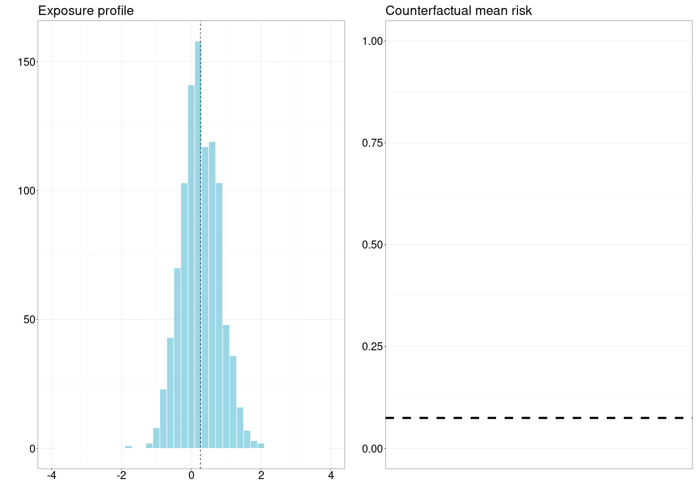 \end{equation}\] 이는 중재 후 밀도 \(g(a - \delta \mid w)\)와 자연적 치료 밀도 \(g(a \mid w)\)의 비율 \(C(\delta)\)가 경계 \(M\)을 초과하지 않을 때 자연적 치료 값 \(A = a\)를 \(\delta\)만큼 이동시키는 중재에 해당합니다. \(C(\delta)\)가 경계 \(M\)을 초과할 경우, 확률적 중재는 해당 단위를 치료 수정에서 제외하여 자연적 치료 값 \(A = a\)로 남겨둡니다.